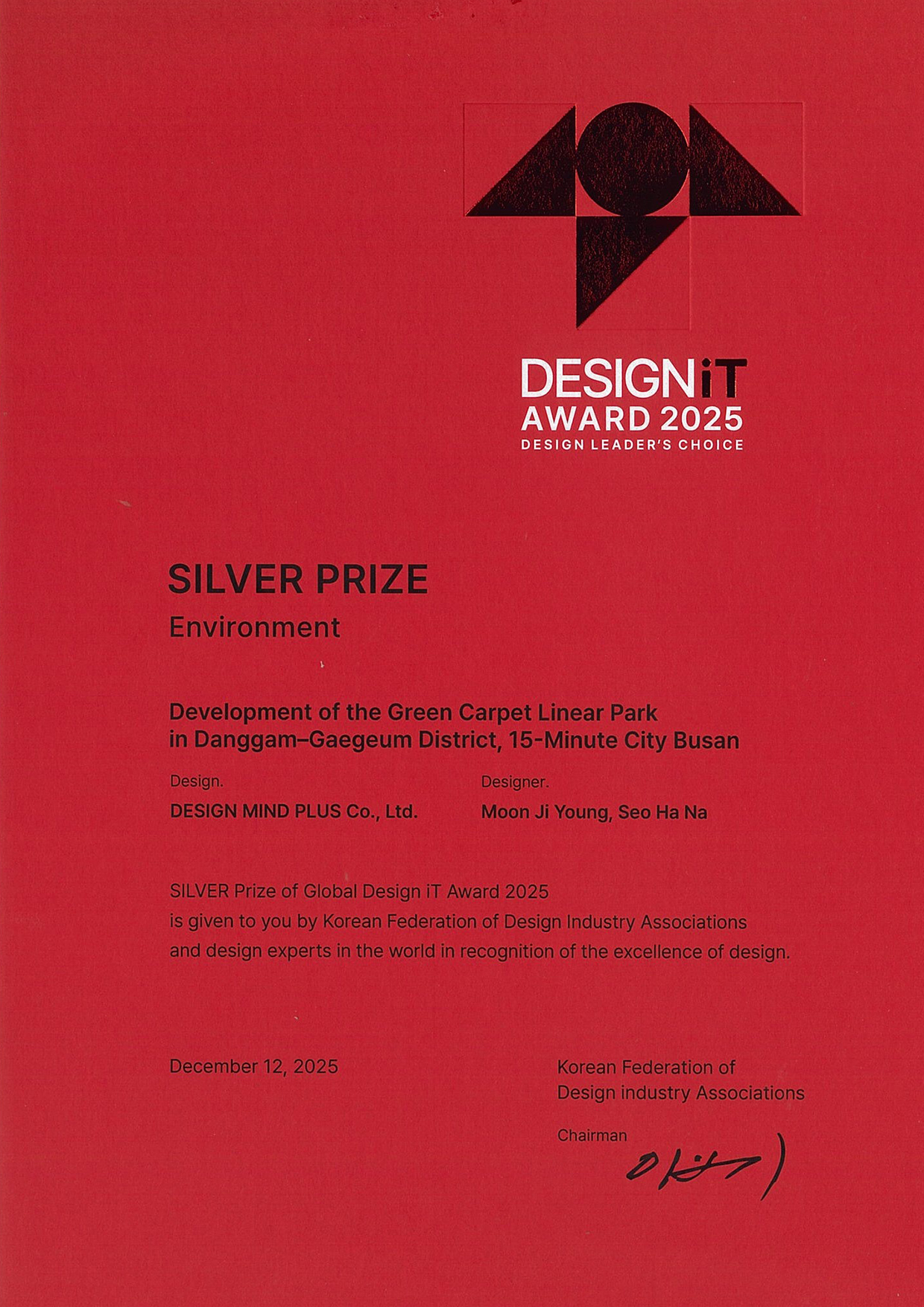 2025 글로벌 디자인잇어워드 은상 당감개금권 15분 도시 선형공원
